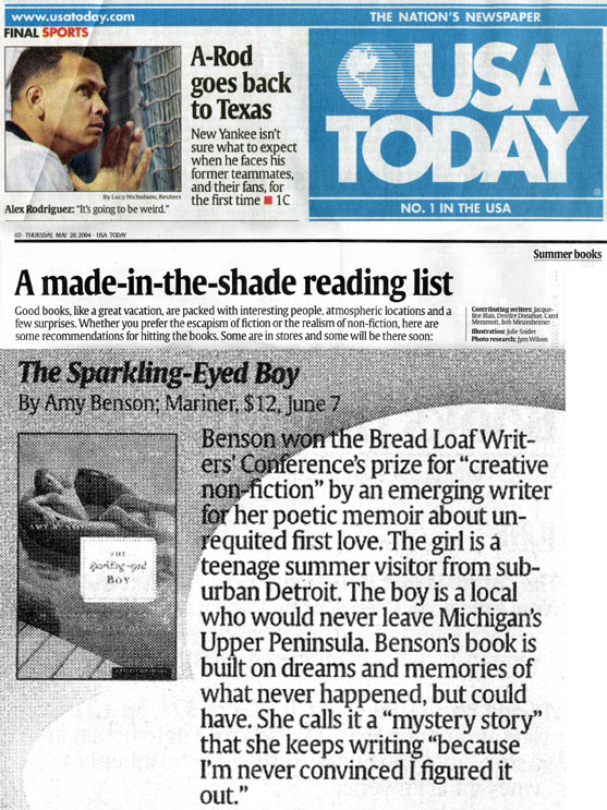 Benson won the Bread Loaf Writer's Conference's prize for "creative non-fiction" by an emerging writer for her poetic memoir about unrequited first love. The girl is a teenage summer visitor from suburban Detroit. The boy is a local who would never leave Michigan's Upper Peninsula. Benson's book is built on dreams and memories of what never happened, but could have. She calls it a "mystery story" that she keeps writing "because I'm never convinced I figured it out."